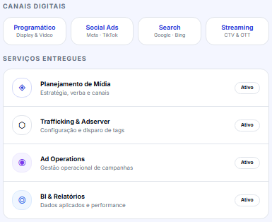 A frente de serviços da AdDesk reúne a operação prática da mídia. Contempla implementação de campanhas, trafficking, adserver, BI aplicado e suporte operacional para agências, veículos e parceiros que precisam de execução com inteligência.