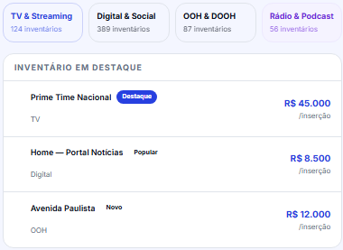 A MediaStore é a frente transacional da AdDesk. Funciona como um marketplace de mídia com capacidade operacional, permitindo comprar, vender, liberar, organizar e acompanhar campanhas em um só ambiente.