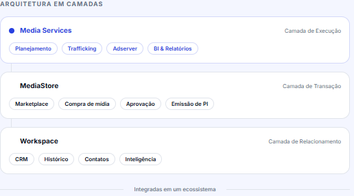 A AdDesk organiza o mercado publicitário em três frentes integradas: Media Services, MediaStore e Workspace — unindo execução, transação e inteligência em um só ecossistema.